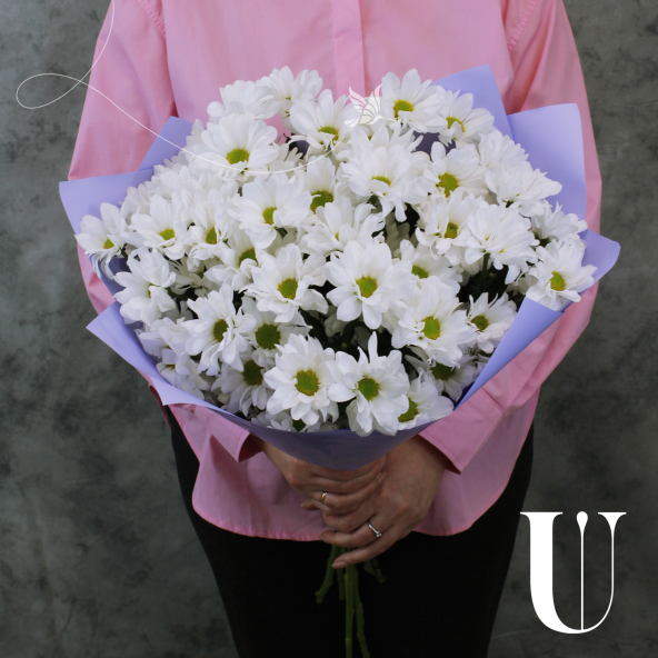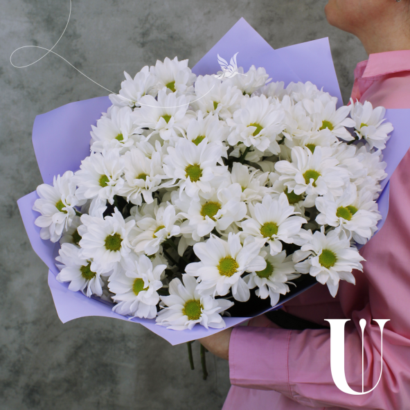 Классический букет из 7 белых кустовых ромашковых хризантем в матовой пленке с атласной лентой — это отличный выбор для тех, кто хочет подарить радость и тепло близким людям.