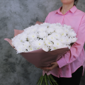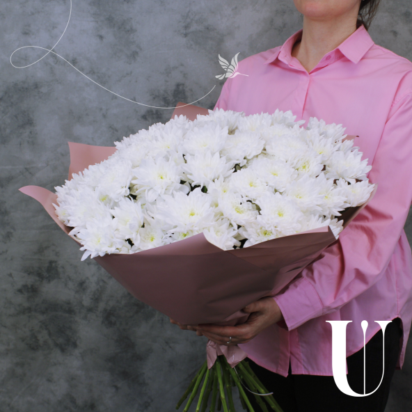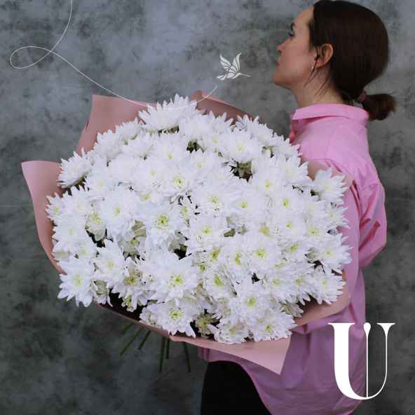 Классический букет из 15 белых кустовых хризантем в матовой пленке с атласной лентой — это отличный выбор для тех, кто хочет подарить радость и тепло близким людям.