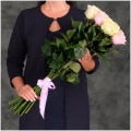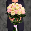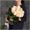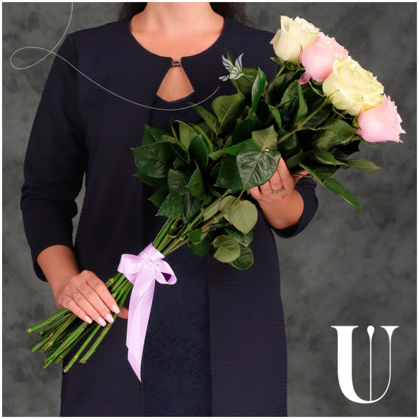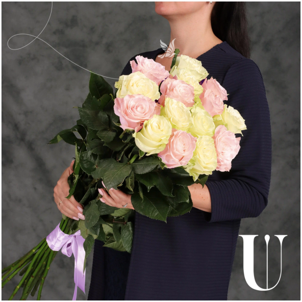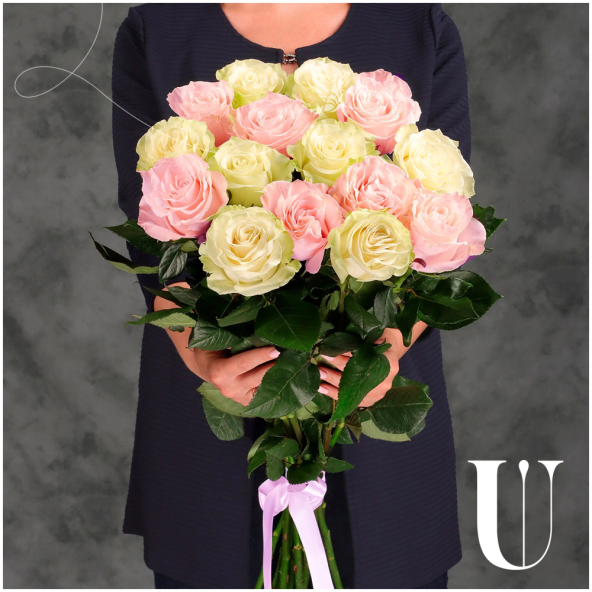 Букет из 15 белых и светло-розовых Эквадорских роз микс 60 см с атласной лентой - это стильный и элегантный подарок, который подойдет для любого повода. В составе букета розы сорта Мондиаль и Пинк Мондиаль– это высококачественные цветы, которые известны своими насыщенными оттенками и приятным ароматом, который будет радовать вас и ваших близких.