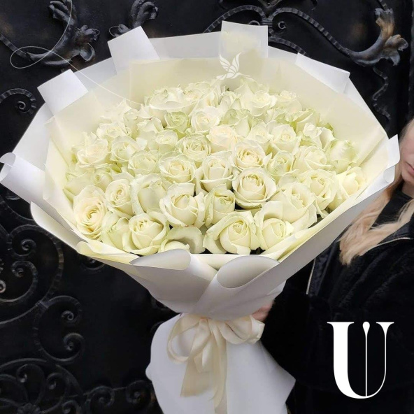 Большой монобукет из 25 белых роз 80 см с атласной лентой