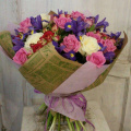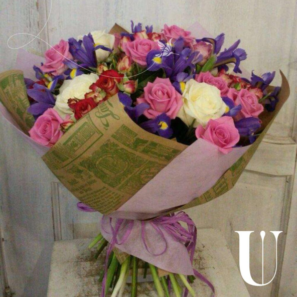 Роза 15шт, роза Мелкоцветная 9 веток, ирисы 11 шт, зелень, упаковка