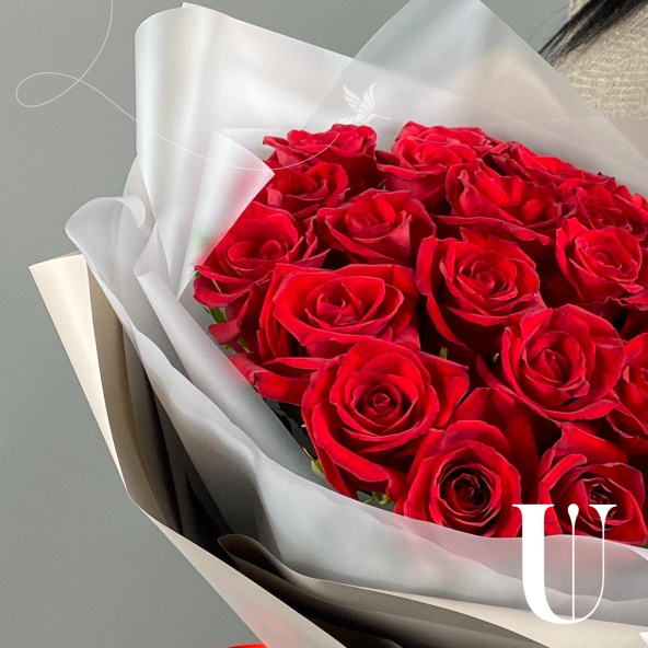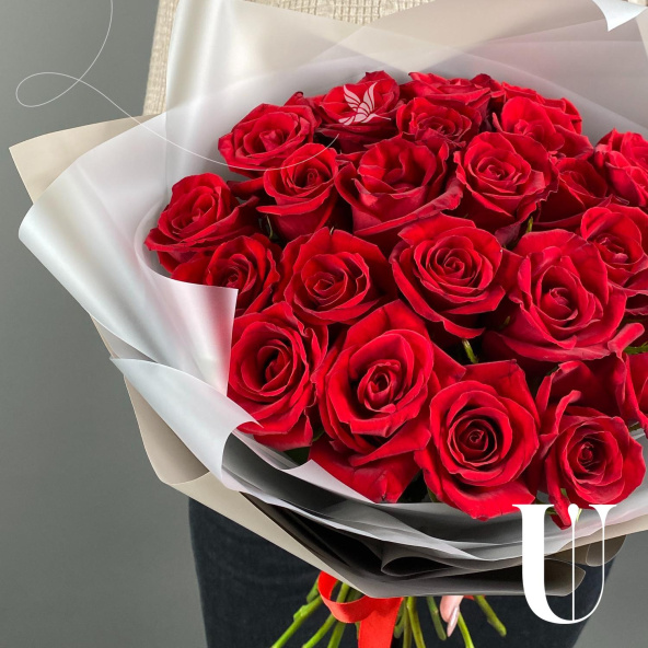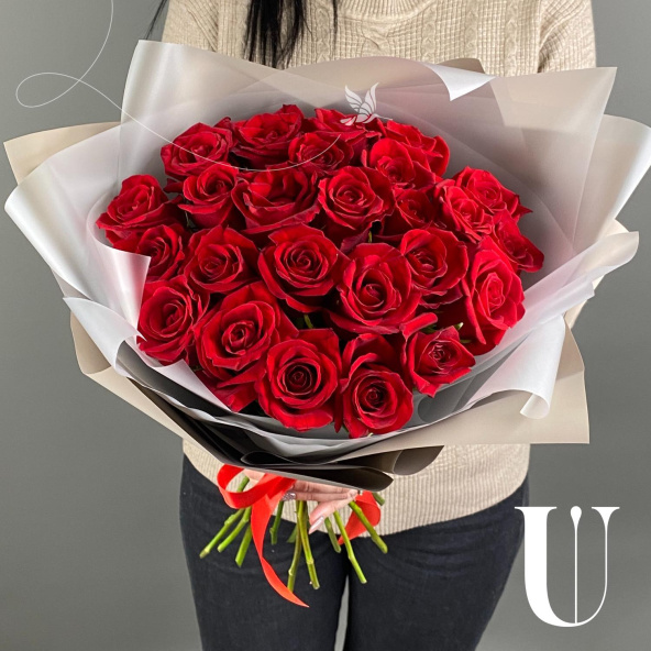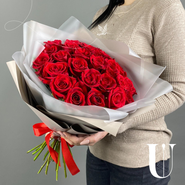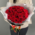 Монобукет из 23 розовых роз в дизайнерской упаковке