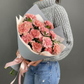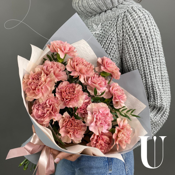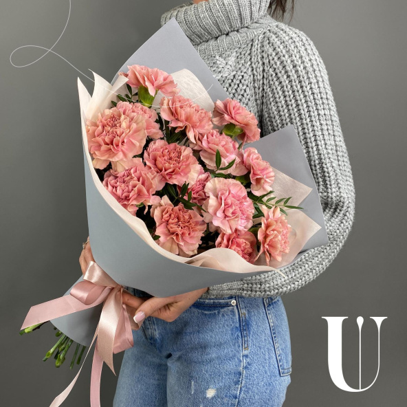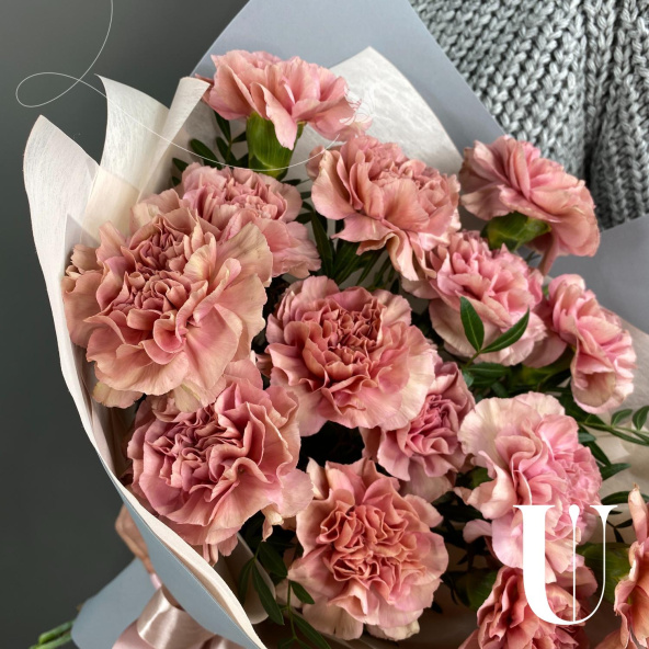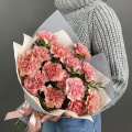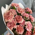 Монокомпозиция из нежных гвоздик в дизайнерской упаковке