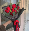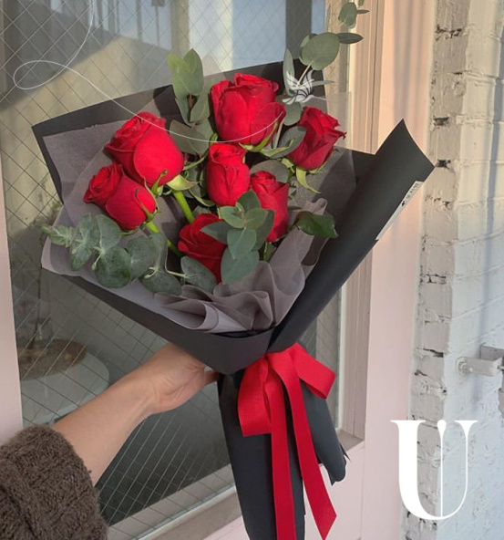 Роза красная 7 шт., упаковка 2 шт., лента 1 шт, эвкалипт 3 шт