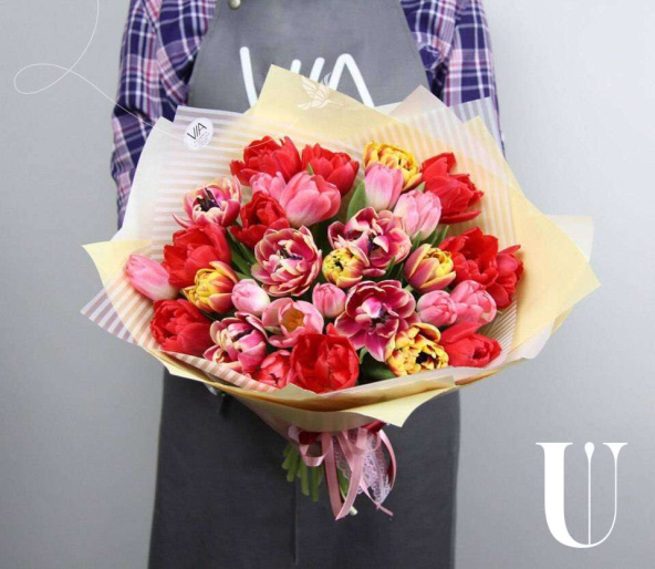 - Состав: Тюльпаны — 31 шт. Высота стебля 35-40 см