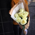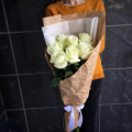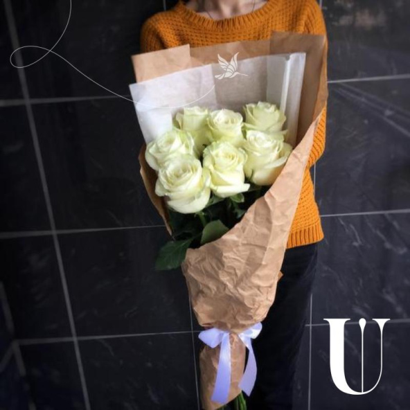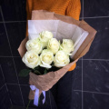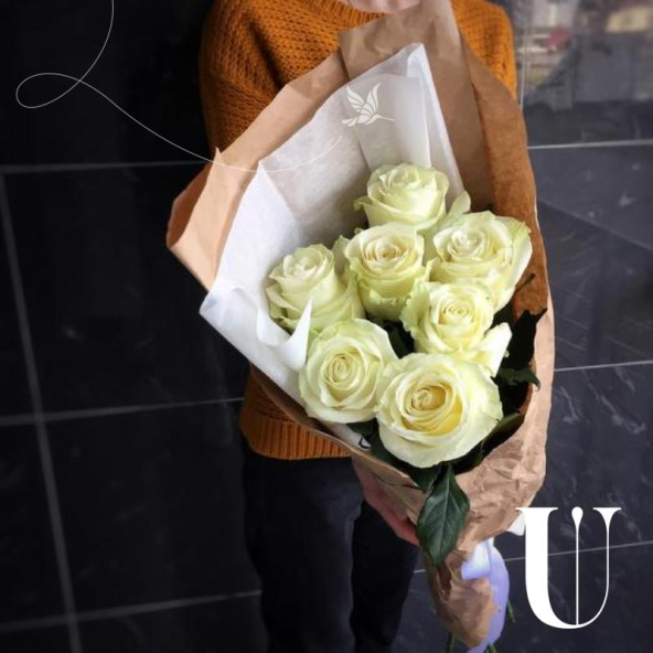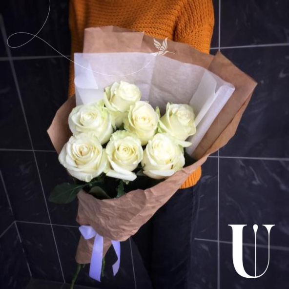- Роза mondial - 7, крафт бумага - 2, тишью - 1, атласная лента - 2