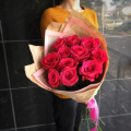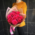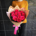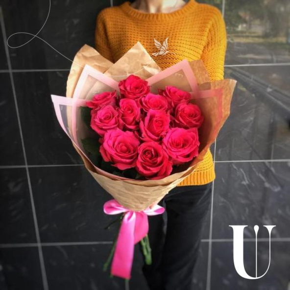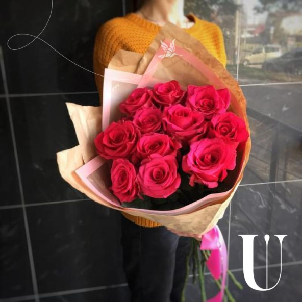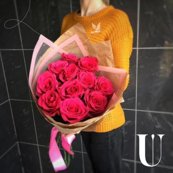 - Роза pink mondial - 11, крафт бумага - 2, пленка дизайнерская - 1, атласная лента - 2