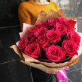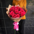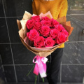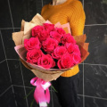 - Роза pink mondial - 15, крафт бумага - 2, пленка дизайнерская - 1, атласная лента - 2