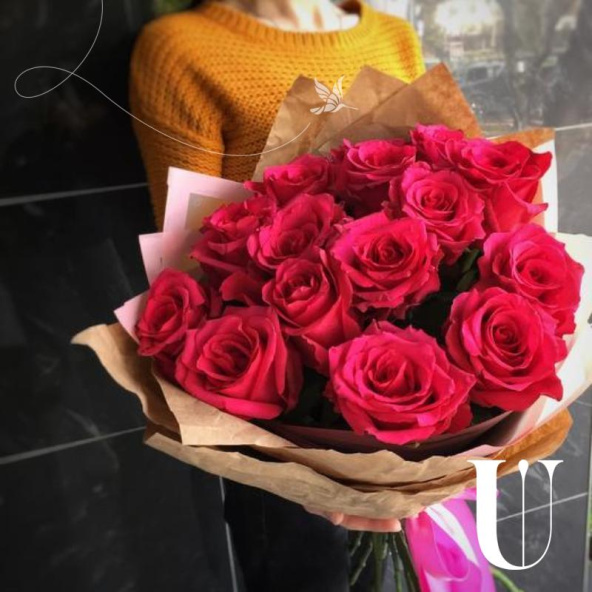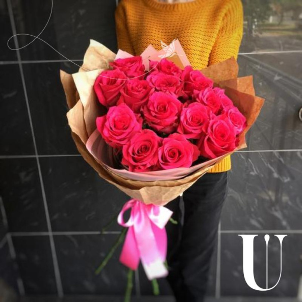 - Роза pink mondial - 15, крафт бумага - 2, пленка дизайнерская - 1, атласная лента - 2