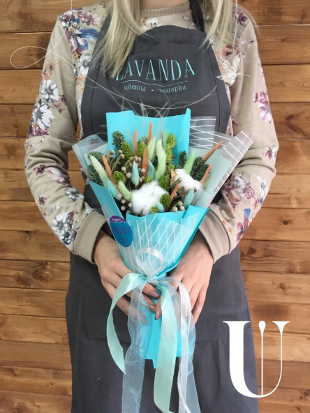 - По- настоящему новогоднее настроение подарит Вам этот необыкновенный букет с запахом настоящих живых веточек сосны сорта Нобилис. Так же в букете присутствует настоящие коробочки хлопка, пушистый лагурус нежных цветов и веточки экзотического растения- бруния. Стильная упаковка удачно подчеркивает цветовую гамму букета. Дарите близким тепло и яркие эмоции! Такой букет отлично подойдет в качестве подарка на новогодние праздники!