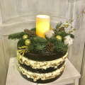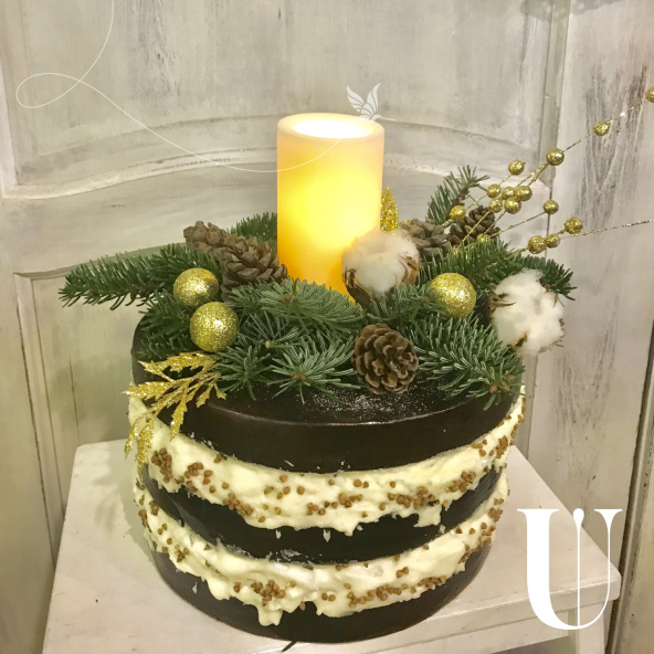- Композиция из живой хвои со свечей и новогодним декором на ДЕКОРАТИВНОЙ ПОДСТАВКЕ в виде торта