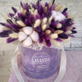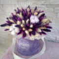 - Лагурус - 200 шт. лаванда - 50 шт. сетария - 30 шт. хлопок - 7 шт. ковыль связка - 5 шт. коробка шляпная - 1 шт.Очаровательная пышная композиция - отличный подарок на день рождения