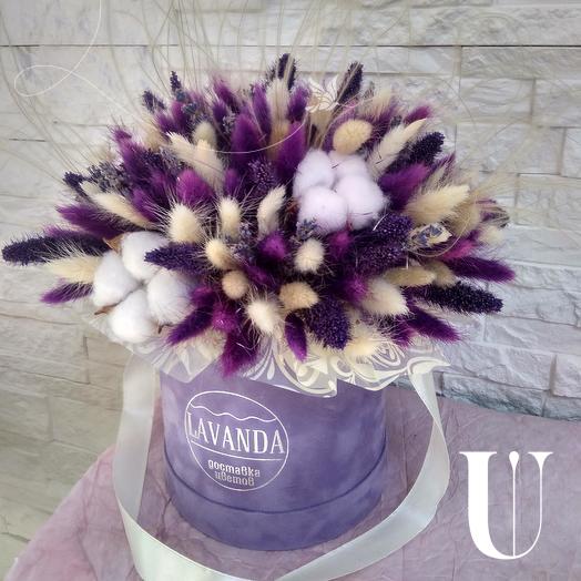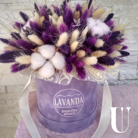 - Лагурус - 200 шт. лаванда - 50 шт. сетария - 30 шт. хлопок - 7 шт. ковыль связка - 5 шт. коробка шляпная - 1 шт.Очаровательная пышная композиция - отличный подарок на день рождения