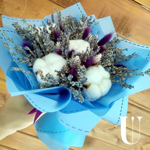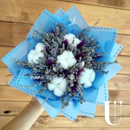 - Лаванда (сухоцвет) - 50 шт. лагурус (сухоцвет) - 11 шт. хлопок (сухоцвет) - 5 шт. упаковка дизайнерская - 1 шт
