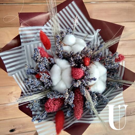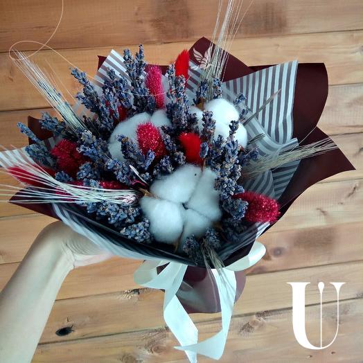 - Колоски пшеницы - 5 шт. лагурус - 5 шт. колоски - 4 шт. хлопок - 3 шт. лаванда пучок - 1 шт. упаковка дизайнерская - 1 шт.Букет из ароматной лаванды и нежного хлопка станет частью вашего интерьера и прослужит вам много лет